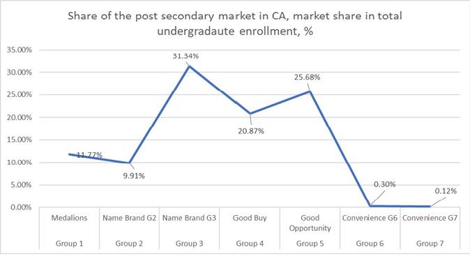 Medallions: the segment for which prestige-based ranking plays a significant role in defining institutional ambitions and quality. Their Market share is 7% of the total number of universities and 4-year colleges in California. A total of 12% of all undergraduate students in California are enrolled in “Medallions”. UC Berkeley and UCLA are the only two public universities within the Californian Medallion group.