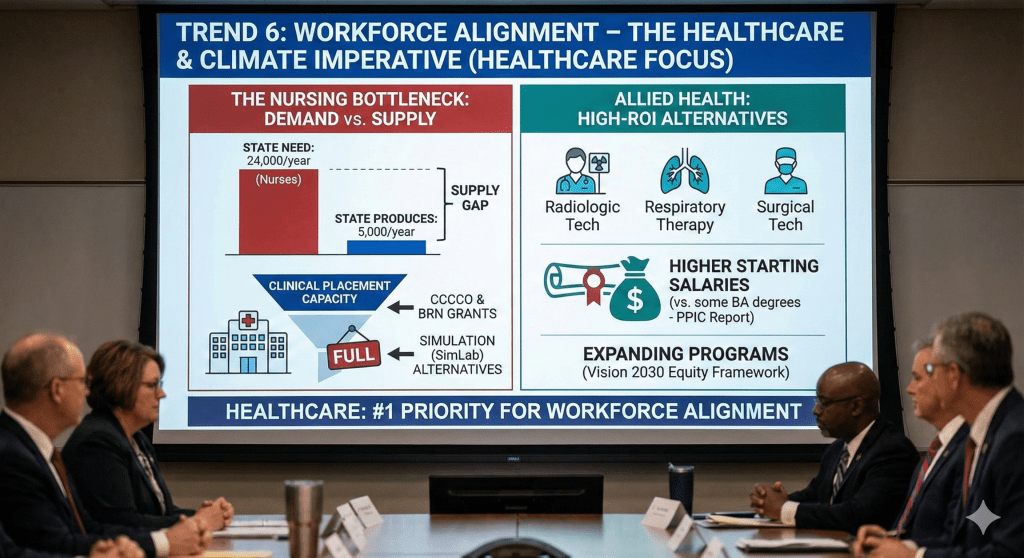 Students are increasingly looking at “Allied Health” careers—Radiologic Tech, Respiratory Therapy, Surgical Tech—as high-ROI alternatives to the impacted Nursing major. A report by the Public Policy Institute of California (PPIC) highlights that these Associate Degree programs often yield higher starting salaries than many Bachelor’s degrees in the humanities. Community colleges are expanding these high-cost, high-reward programs as part of the “Vision 2030” equity framework.
