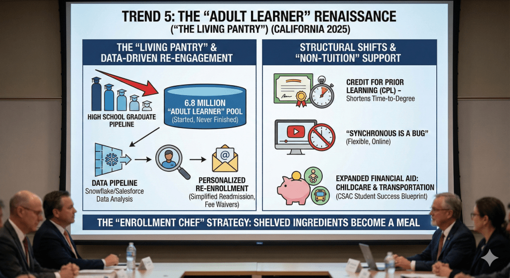With the high school pipeline shrinking (the “Enrollment Cliff”), California institutions are turning their attention to the 6.8 million adults in the state who started college but never finished. This is the “Living Pantry” described in the Enrollment Chef blog—ingredients that were shelved but can be brought back to create a meal.