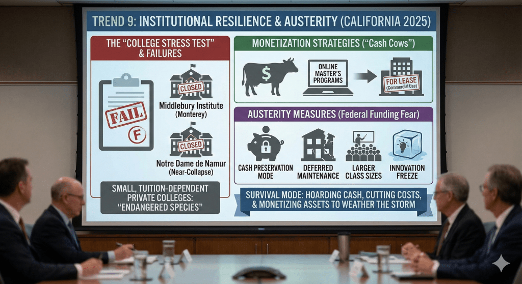 The “College Stress Test” isn’t just for students; institutions are failing it. The closure of the Middlebury Institute’s Monterey campus and the near-collapse of Notre Dame de Namur are cautionary tales. Small, tuition-dependent private colleges in California are on the endangered species list. To survive, institutions are trying to monetize everything. Campus real estate is being leased for commercial use. Online master’s programs are being launched as “cash cows” to subsidize the undergraduate mission. Universities are hoarding cash. The fear of federal funding cuts has led to a “cash preservation” mode. This means deferred maintenance on buildings, larger class sizes (to save on adjunct pay), and a freeze on innovative but risky new programs.