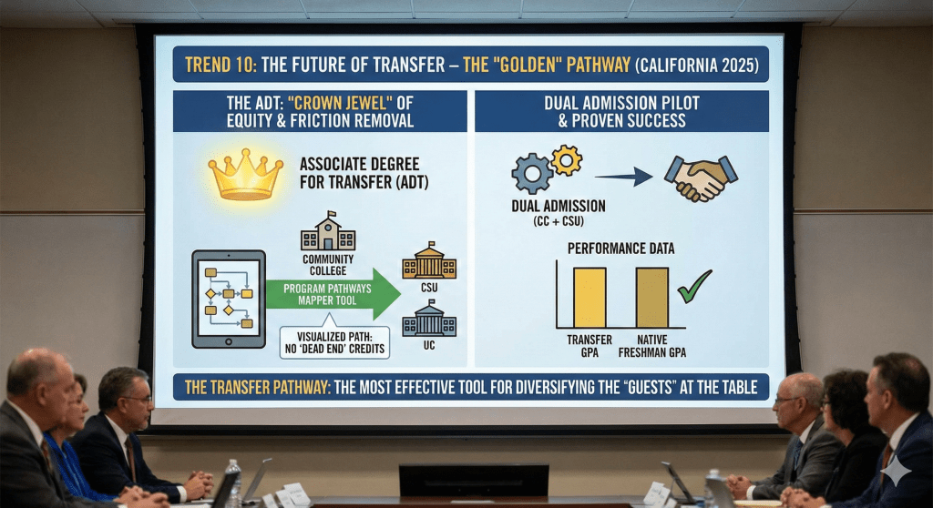 The Associate Degree for Transfer (ADT) is the crown jewel of California’s equity strategy. In 2025, the focus is on friction removal. Program Pathways Mapper software tool, now widely adopted, visualizes the path from community college to CSU/UC, ensuring students don’t take “dead end” credits. The pilot programs offering “Dual Admission”—where a student is admitted to a CSU while at a community college—are showing promise in keeping students on the path. Data shows that transfer students perform as well as, or better than, native freshman. The transfer pathway is the most effective tool for diversifying the “guests” at the table.