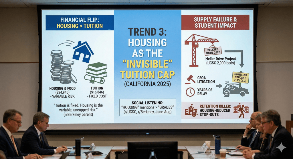 The “supply” side of the kitchen is broken. Universities are attempting to build their way out of the housing crisis, but they are thwarted by economic and legal headwinds. At UC Santa Cruz, the massive “Heller Drive” project, promised to deliver 2,900 beds, was delayed until at least 2027. The delay was communicated to students in July 2025—just weeks before the semester—causing chaos for student families who had counted on that capacity. Local community groups continue to use the California Environmental Quality Act (CEQA) to sue universities over enrollment growth, arguing that more students equal more traffic and noise. This litigation stalls projects for years, driving up costs and leaving students homeless. The housing crisis is a retention killer. Data indicates that 11% of CSU students experience homelessness. When a student cannot find a stable place to sleep, they cannot study. We are seeing a trend of “housing-induced stop-outs,” where students in good academic standing withdraw simply because they lost their lease. The “Enrollment Chef” must recognize that a bed is now a prerequisite ingredient for a degree.