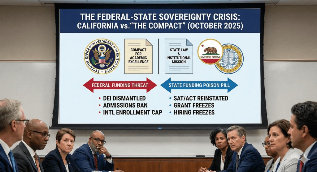 The specific terms of the Compact are engineered to dismantle the prevailing governance model of California’s public institutions. The Compact mandates the dismantling of Diversity, Equity, and Inclusion (DEI) offices. In California, where equity is a statutory goal of the Master Plan and deeply embedded in the “UC 2030” and “CSU Forward” strategic plans, compliance would require violating state mandates and institutional mission statements.