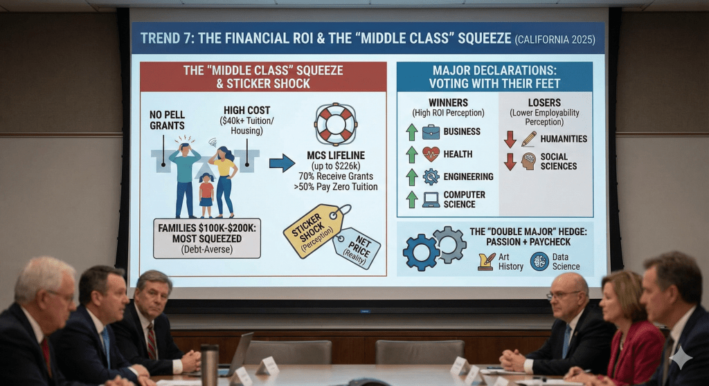 In 2025, the “Return on Investment” (ROI) conversation has moved from the kitchen table to the application portal. Families are price-sensitive and debt-averse. Families earning $100k-$200k are the most squeezed. They don’t get Pell Grants, but they can’t write a $40k check for UC tuition + housing. The “Middle Class Scholarship” (MCS) has been a lifeline, now covering families earning up to $226,000. The data shows that 70% of UC undergraduates now receive grants, and over half pay zero tuition. Despite this, the perception of high cost remains. “Sticker shock” deters applications. The Enrollment Chef must better communicate the “Net Price” vs. “Sticker Price.”