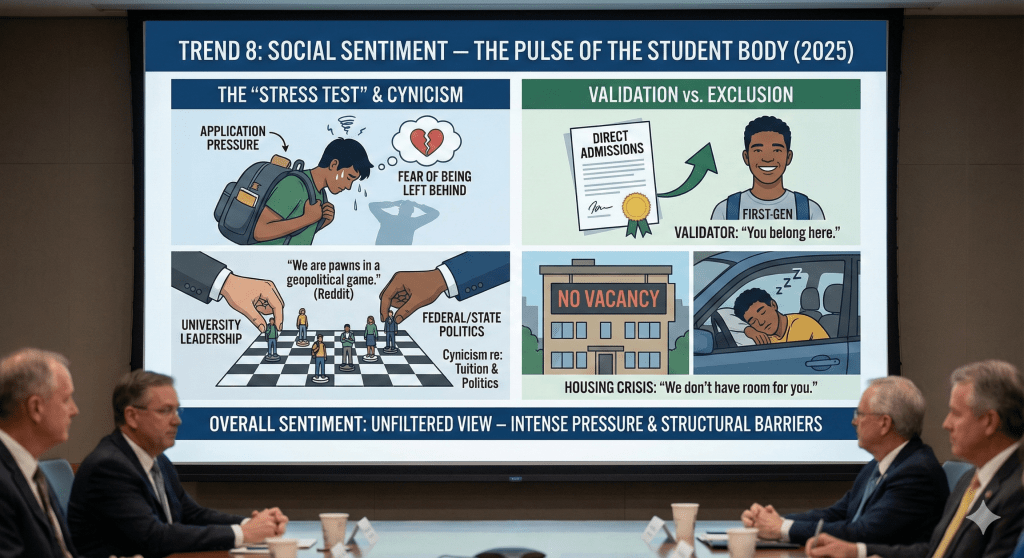 Social listening on platforms like Reddit provides a raw, unfiltered view of the student psyche. Students describe the college application process not as a journey of discovery, but as a “Stress Test”. They feel intense pressure to perform, driven by the fear of being left behind in a bifurcated economy. For first-generation students, the “Direct Admissions” letter is a powerful validator. It signals, “You belong here.” Conversely, the housing crisis signals, “We don’t have room for you.” There is a pervasive cynicism about university leadership, particularly regarding tuition hikes and the handling of the federal/state political fights. Students feel like pawns in a larger geopolitical game.