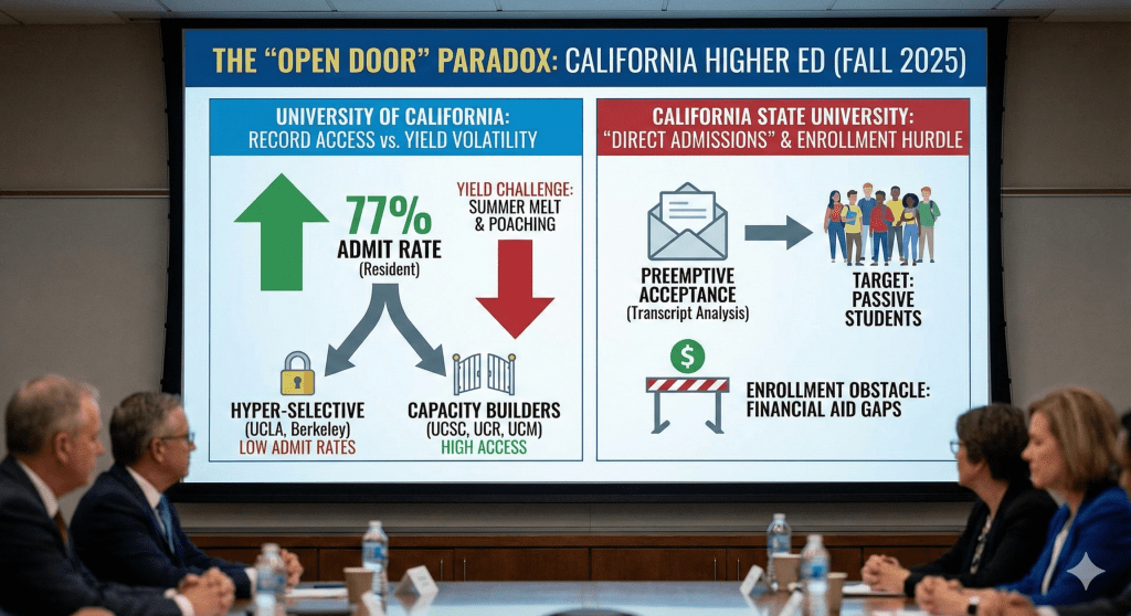 California State University System: while the UC opens its doors, the CSU is removing the doorframe entirely. Facing soft enrollment post-pandemic, the CSU system launched a “Direct Admissions” program for Fall 2025. Instead of waiting for students to apply, the CSU analyzed high school transcripts to identify eligible seniors and preemptively mailed them acceptance letters. This strategy specifically targets the “passive” student—often first-generation or low-income, who assumes they aren’t “college material” or is daunted by the application fees and bureaucracy. While official census data is pending, anecdotal reports from CSU admissions officers suggest a surge in “interest” from this segment, though converting that interest to enrollment remains a challenge due to financial aid literacy gaps.